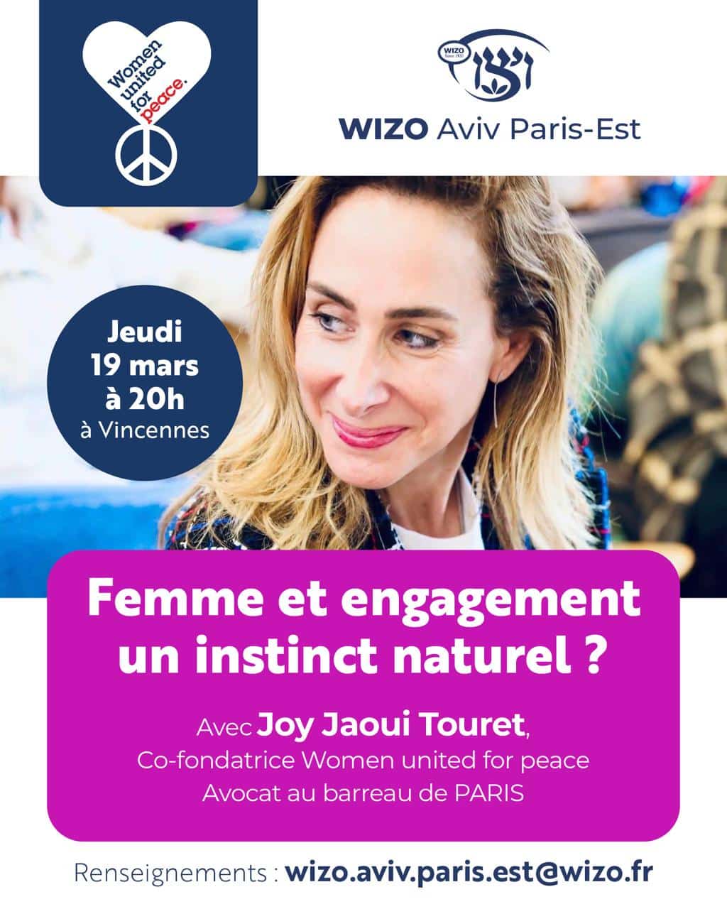 La section WIZO AVIV Paris Est en partenariat avec Women United for Peace a le plaisir de vous convier à une nouvelle soirée pensée par et pour les femmes actives et engagées